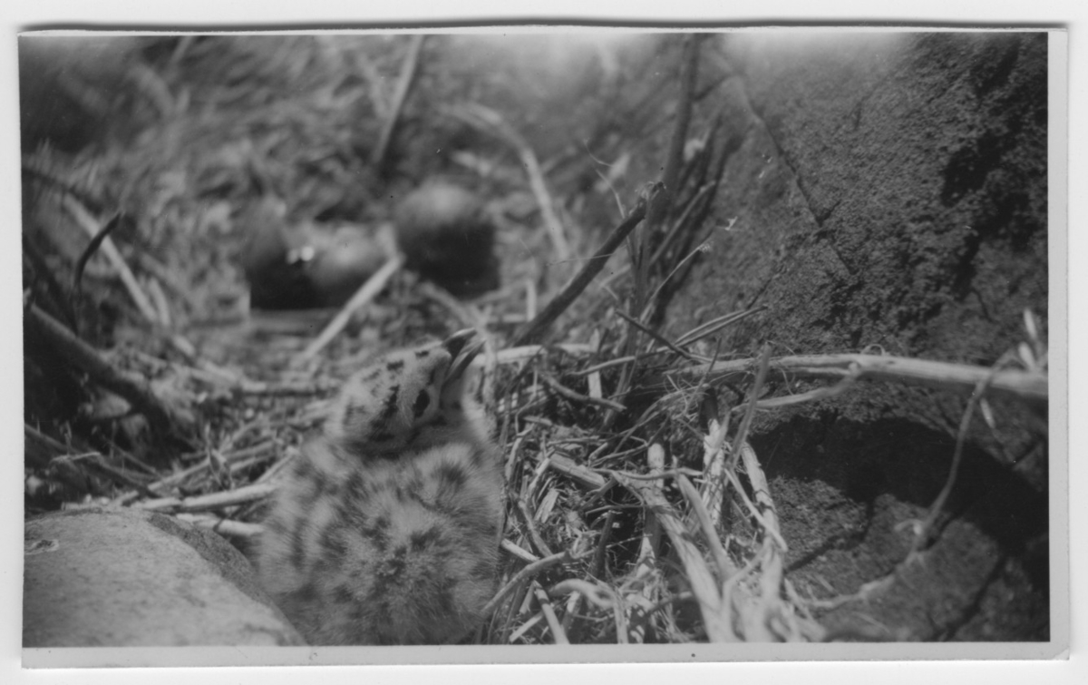 '1 unge av gråtrut samt i bakgrunden ägg i bo. :: :: Text på baksidan av fotot: ''1 ca 10 dagar gammal gråtrutunge i en bergskreva. Troligen är de 2 äggen i redet obefruktade. Fotot taget med 40 cm lins.'' :: :: Ingår i serie med fotonr. 4500:1-172.'