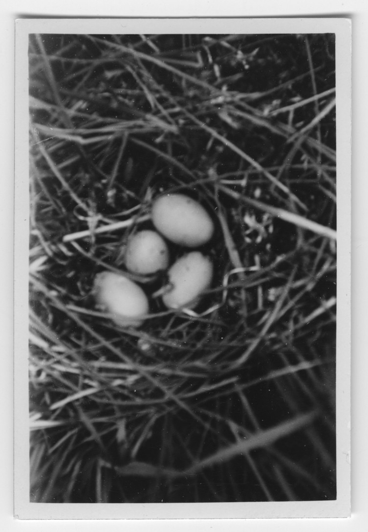 'Bo med 4 st ägg av vigg. :: :: Text på baksidan av fotot: ''Bo med 4 st nyvärpta ägg av viggen i starrgräs ungefär 10 meter från stranden. Reden bestod av färskt gräs. Fotot är taget på 55 cm avstånd.'' :: :: Ingår i serie med fotonr. 4500:1-172.'