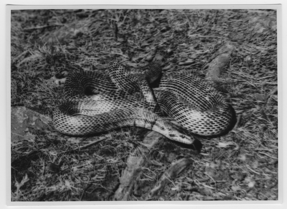 '1 st orm ligger ihopringlad på marken. :: :: Ingår i serie med fotonr. 4501:1-60 ur ingenjör Otto Cyréns ''Ormar i fantasi och verklighet''.'