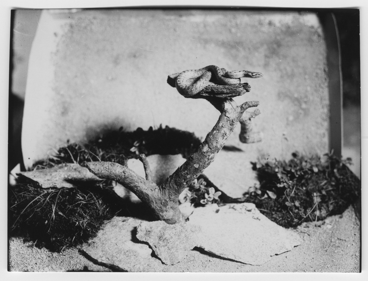 '1 hasselsnok ligger ihopringlad på en gren i ett terrarium. :: :: Ingår i serie med fotonr. 4501:1-60 ur ingenjör Otto Cyréns ''Ormar i fantasi och verklighet''. Del av bilden använd på s. 124 i verket.'