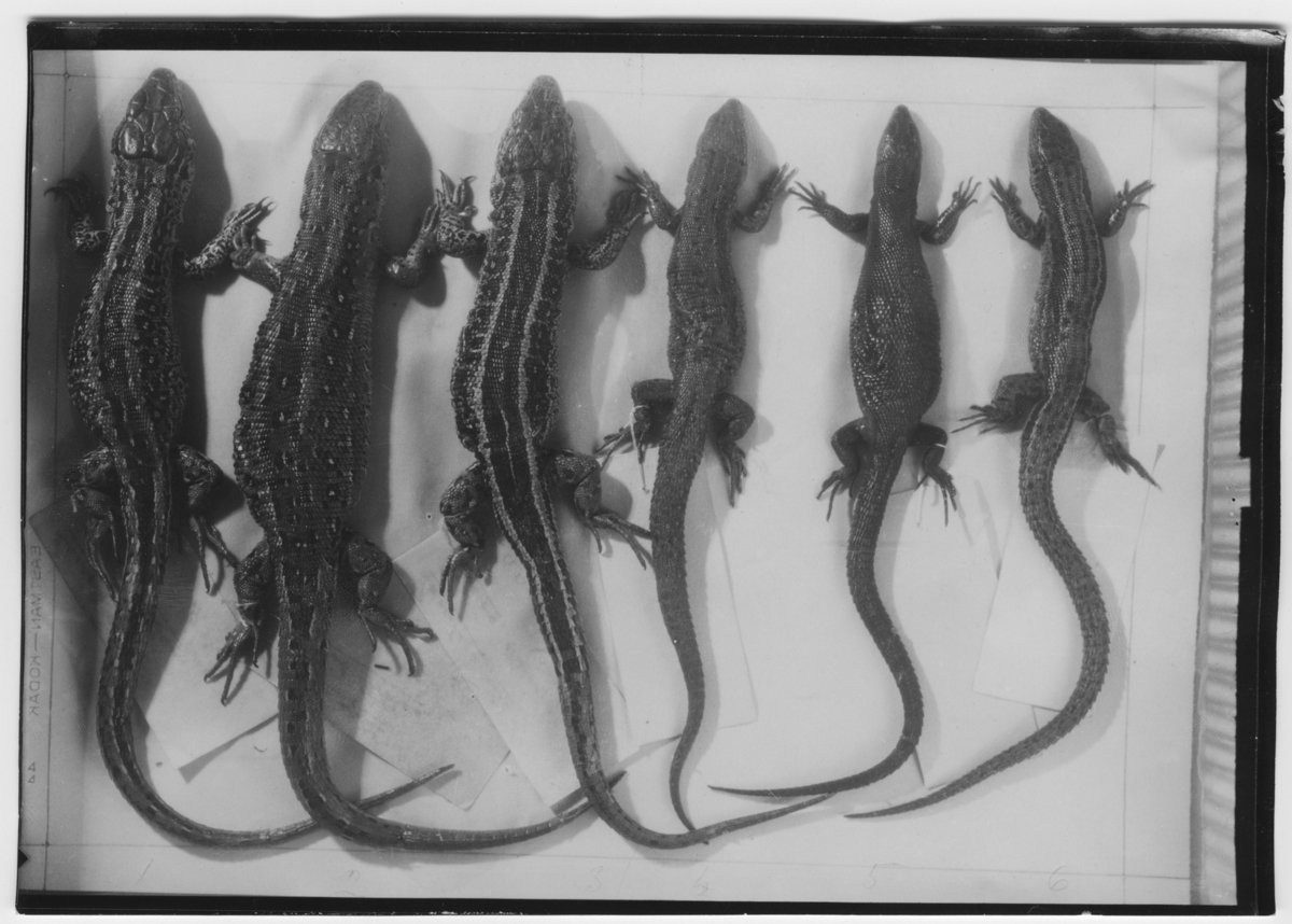 '6 st ödlor lagda intill varandra. Fotografier över sandödla och skogsödla, ur ingenjör Otto Cyréns ''Sandödlan och skogsödlan''. :: Fauna och Flora 1928:6. :: :: Ingår i serie med fotonr. 4503-4504.'