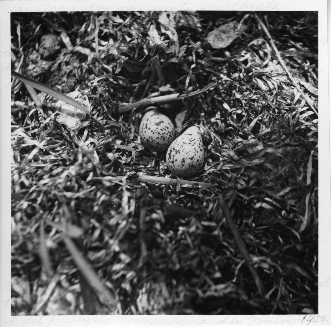'Enligt anteckning på fotografiets baksida: :: ''Här ligger den sällsynta svartbenta strandpiparehonans 2 sandgula ägg med svarta och grå ytfläckar. Som synes av bilden ligga äggen direkt på en torr tångbänk, 30 meter lång och 5 meter bred: någon sandstrand fanns inte. Bilden togs på 33cm avstånd. Boet låg 100meter från den stora skärfläckskolonien på det fridlysta Hammarnäs.'' :: :: Ingår i en serie med fotonr. 4512:1-57 med diverse foton av fågelbon med ägg och ungar. Varje fotografi har utförliga anteckningar på sin baksida, kopierade från framsidan, spår av de på framsidan är fortfarande synliga.'