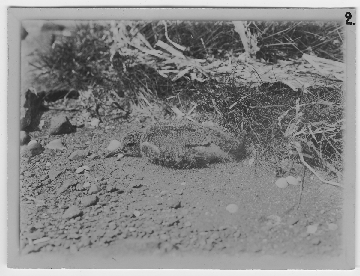 'Strandskata, tryckande unge på marken. :: :: Ingår i serie med fotonr. 450-467.'
