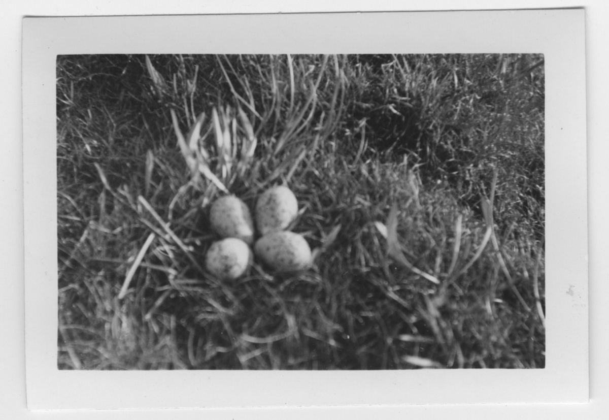 'Bo med 4 ägg av skärfläcka. Oskarp bild. :: :: Text på baksidan av fotot: ''Skärfläckans bo med 4 st ca 10 dagar ruvade ägg på gräsholmen invid Getterön. Reden bestod av torrt gräs och äggens storlek 48 mm i längd och 34 mm i bredd.'' :: :: Ingår i serie med fotonr. 4544:1-35.'