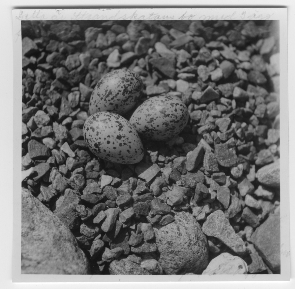 '3 st ägg av strandskata, liggande på bädd av småsten. :: :: Text på fotot: ''Detta är strandskatans bo med 3 st ägg fullruvade liggande direkt på småstenar i en vik på Lindholmen ca 10 meter från strandkanten.'' :: :: Ingår i serie med fotonr. 4545:1-34.'