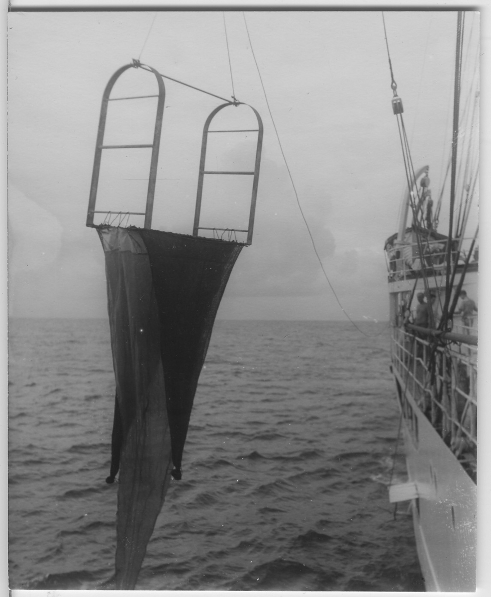 'Nilssons slädtrål före drag på Station 373. ''Albatross'', trålen hänger vid sidan av båten. :: Ingår i serie fotonr. 4622-4629.'