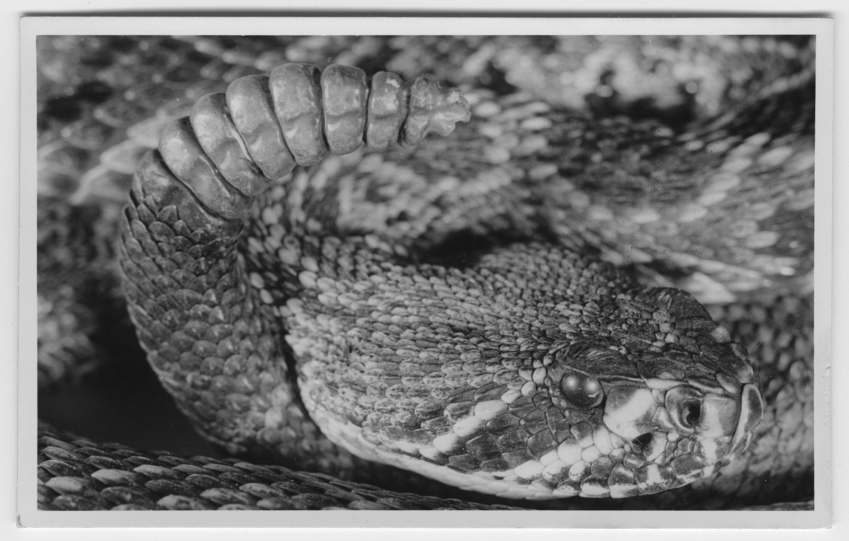 Titel: 'Nordamerikansk diamantskallerorm. Närbild på huvud och skallra. :: :: Ingår i serie med fotonr. 4653-4657, 4659-4672.'