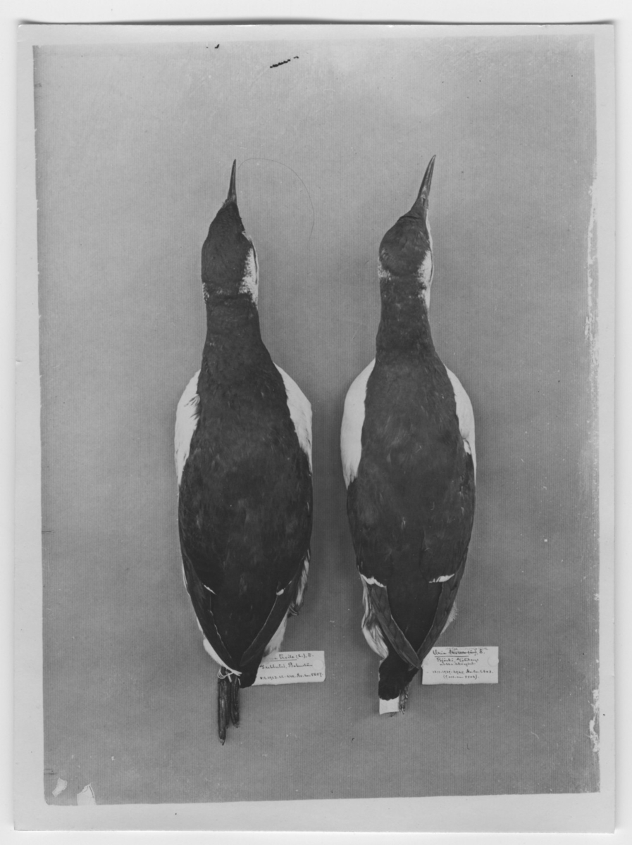 '2 st skinn av sillgrissla: till vänster Uria troile, hane från Grebbestad 1923-01-08, Gen. Kat. 1926-4411, Av. Su. 5807. Till höger Uria aalge, hane från Björkö, Av. Su. 6603, Coll. An. 5504. :: :: 1929-01-12. Ur F. Salomonsen: The Atlantik Alcidae. Sid. 34.'