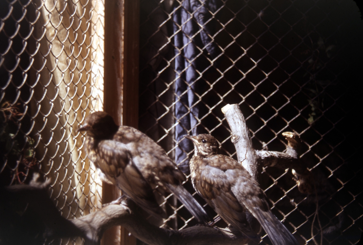 Titel: '2 bastarder mellan björktrast och koltrast, innanför nät i bur. Närbild på fåglarna sittande på gren. :: :: Ingår i serie med fotonr. 4696:1-5. Se även fotonr 4652.'