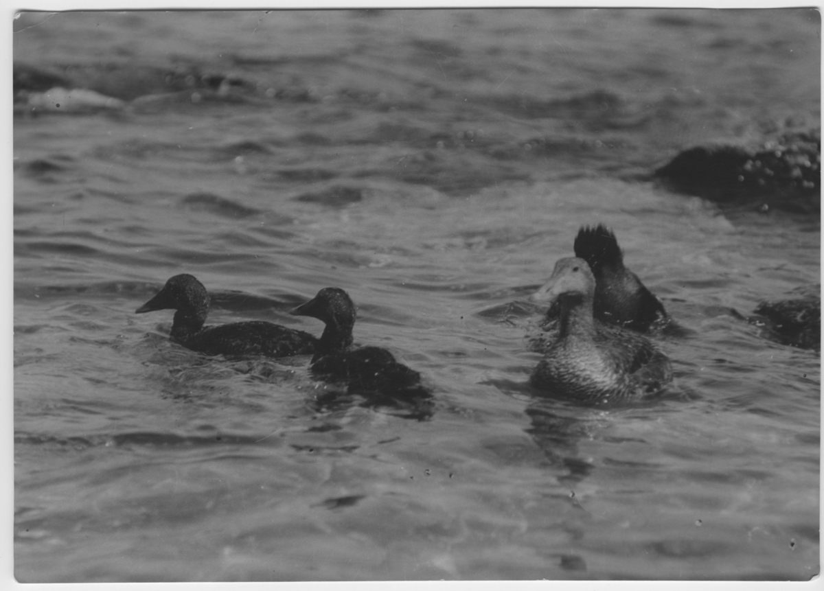 'Ejderfamilj simmar , närbild. ''Text på baksidan: ''Ejderfamilj i matbestyr.'' :: :: Ingår i serie med fotonr. 4769-4774.'