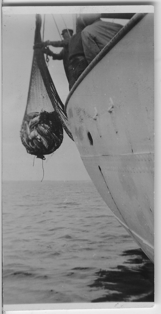 'Ombord på''Skagerack''. :: :: Trålen tas upp. Hängande vid sidan av båten. :: Ingår i serie fotonr. 4776:1-13'