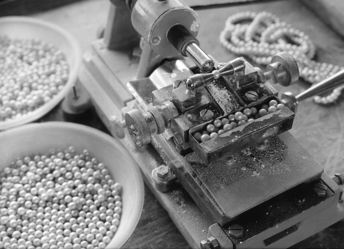'Bilder till monter 254 med pärlhantering, i basutställningen. Tillverkning av pärlhalsband. :: :: Pärlor och maskiner.'