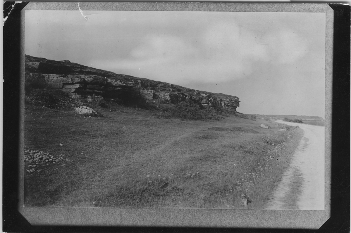 Vy med öppna gräsmarker, grusväg. Vy med landborg av kalksten. Sedimentära lager.
