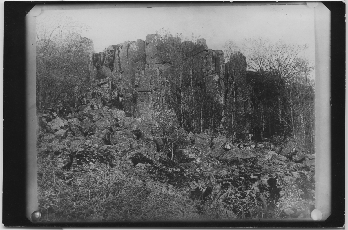 'Kalkbrott och diabasformation. Vy med rasbrant. Lösa stenblock liggande i hög. :: :: Serie fotonr 4854-4864'