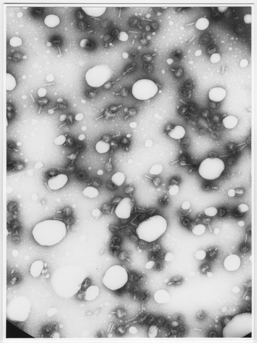 'Foton av bakteriofager i 60.000 x förstoring. Nr 9199 Gotte L. :: :: Se även fotonr. 4969:2.'