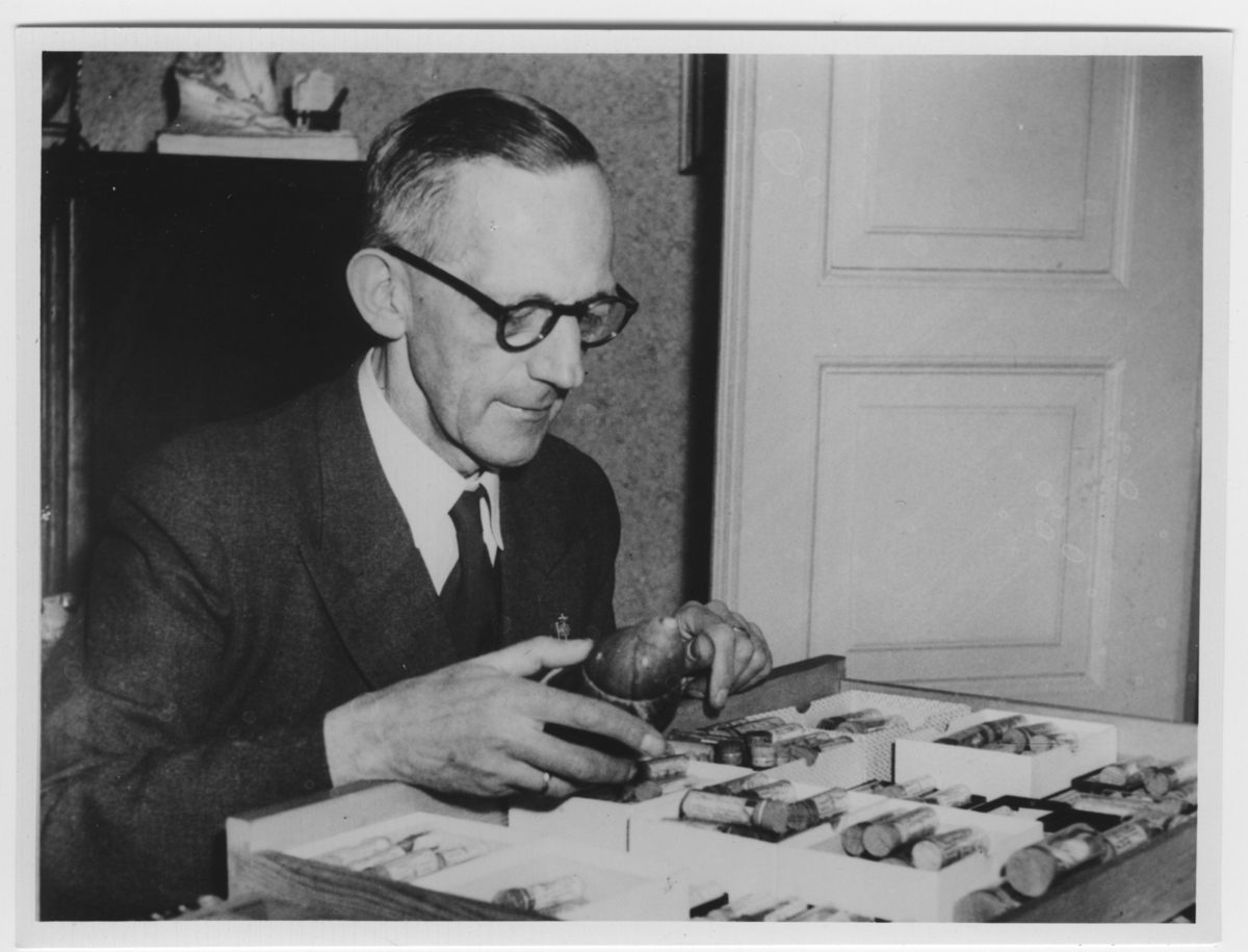 Hans Schlesch sittande vid ett bord, håller en stor snäcka i handen.