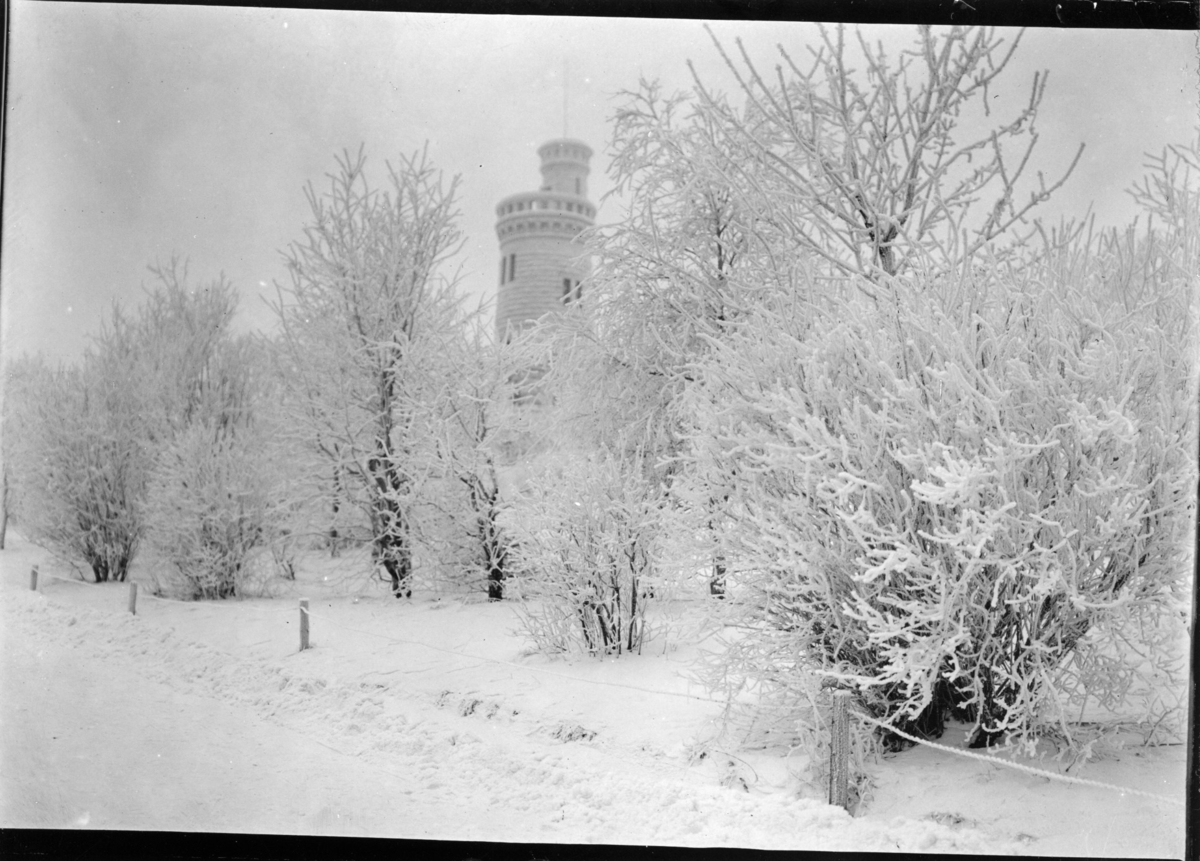 Vinterbild med rimfrost och snö med utsiktstornet i Slottsskogen i bakgrunden. Vinterlandskap.