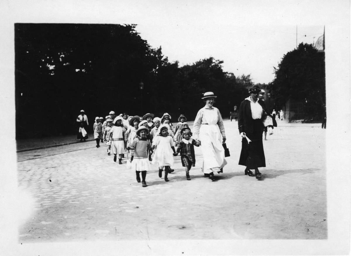2 kvinnor leder en lång rad med barn, ca 20 st barn. Gående på öppen stensatt yta.