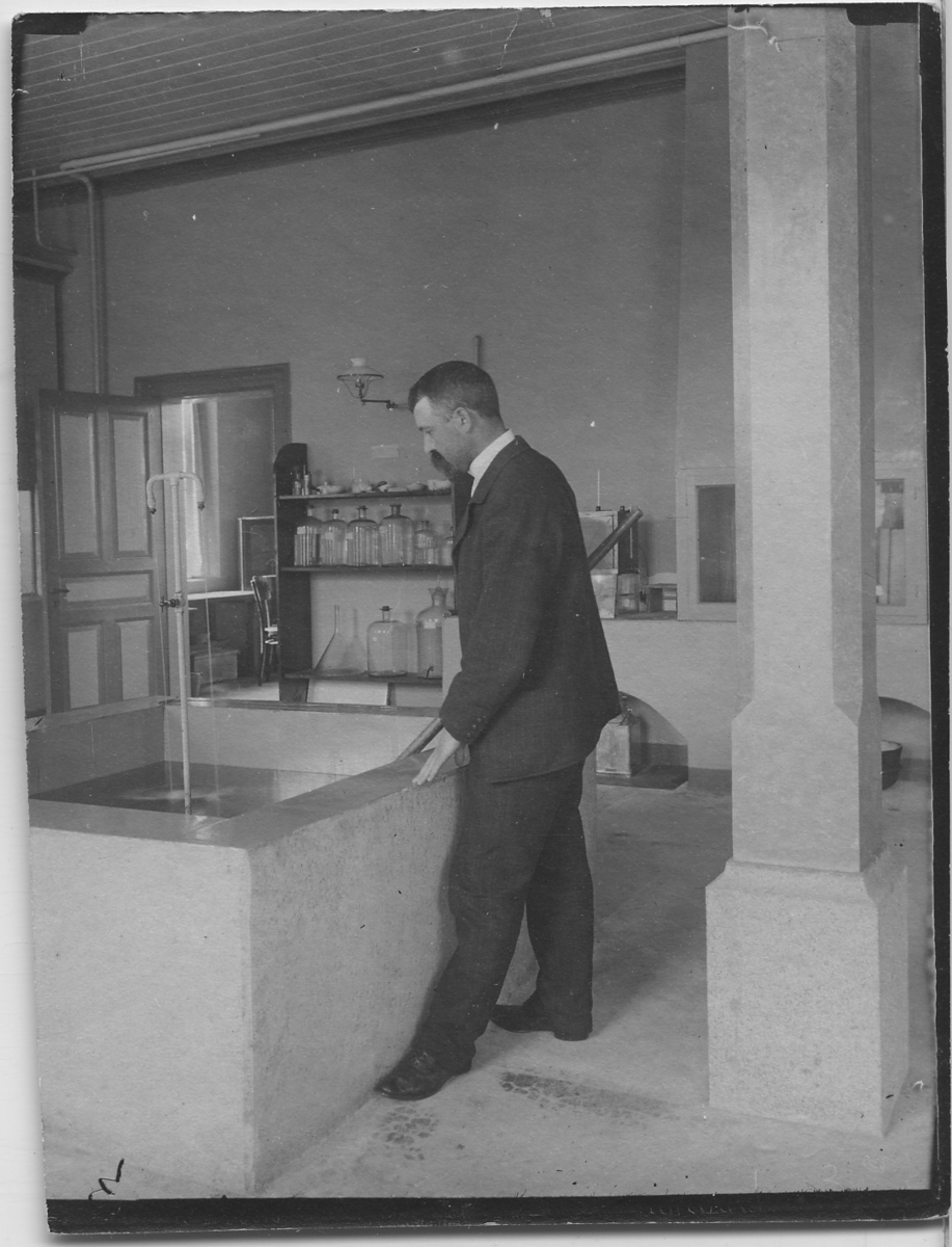 'Kristinebergs Zoologiska station. :: :: Hjalmar Östergren ståendes inne i ett laboratorium, vi ett kar fyllt med vatten. I bakgrunden hylla med diverse glasburkar, flaskor och tratt. :: :: Ingår i serie med fotonr. 5103:1-24.'