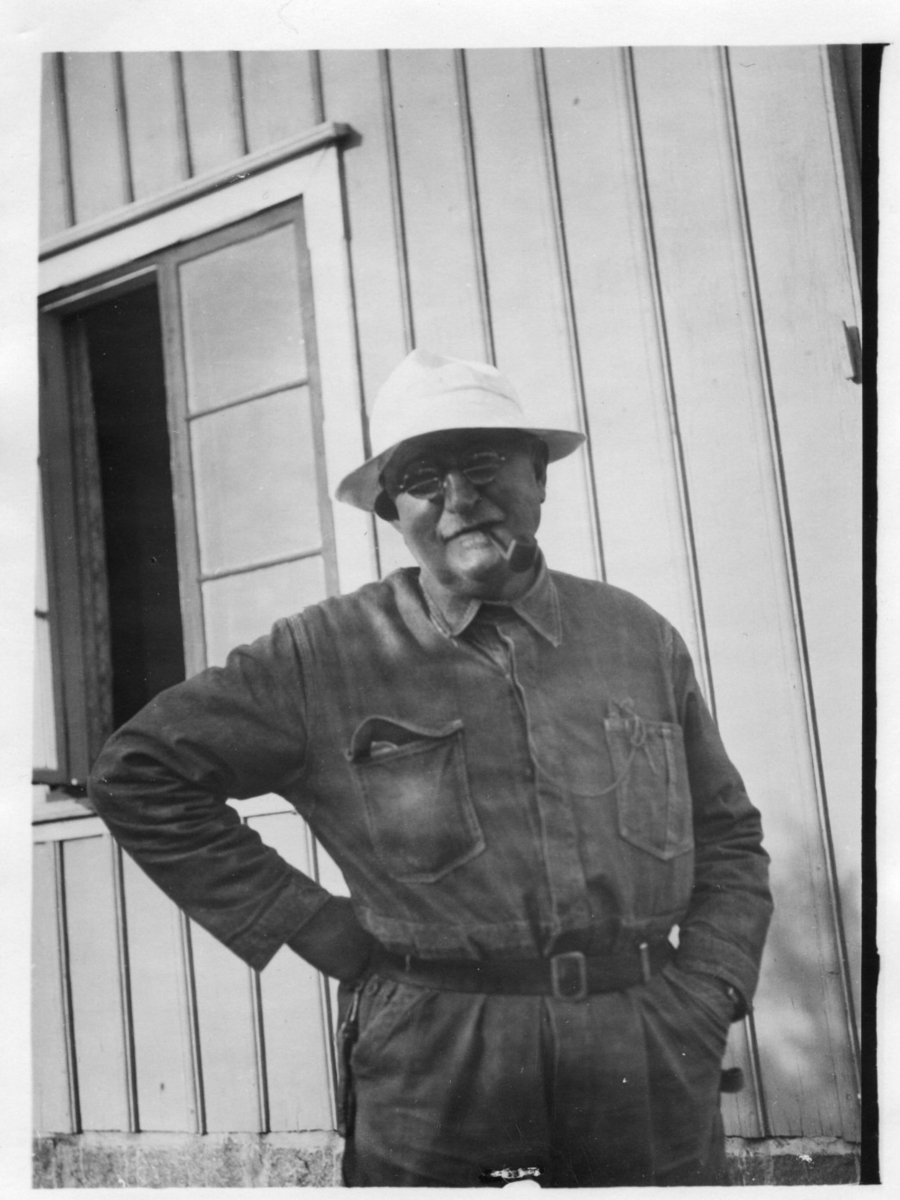 Närbild på Leonard Axel Jägerskiöld stående med pipa i munnen framför ett trähus.