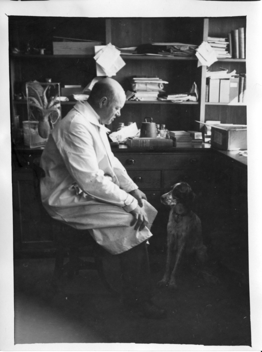 Paul Henrici i sitt arbetsrum vid skrivbordet, en hund sitter på golvet.