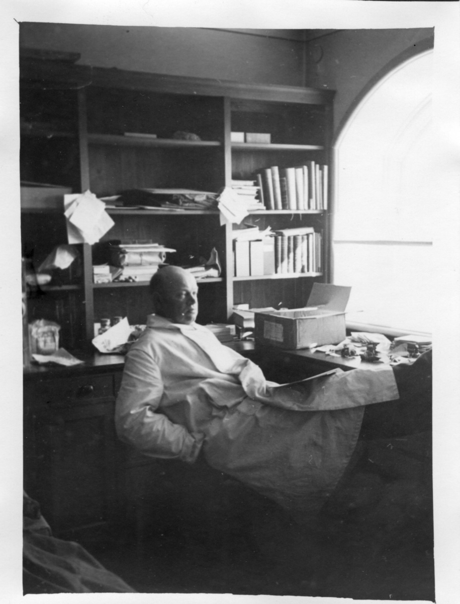 Paul Henrici i sitt arbetsrum, tillbakalutad vid sitt skrivbord.