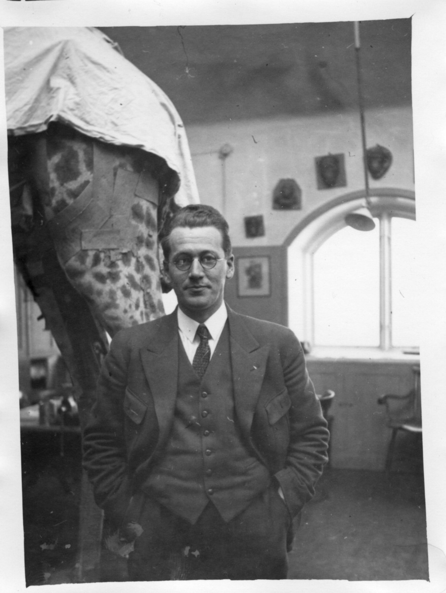'Serie med 8 fotografier på Sune Swärd som varit verksam på Götebrogs Naturhistoriska Museum. :: :: Sune Swärd stående invid museets giraff, i konservatorsateljén.'