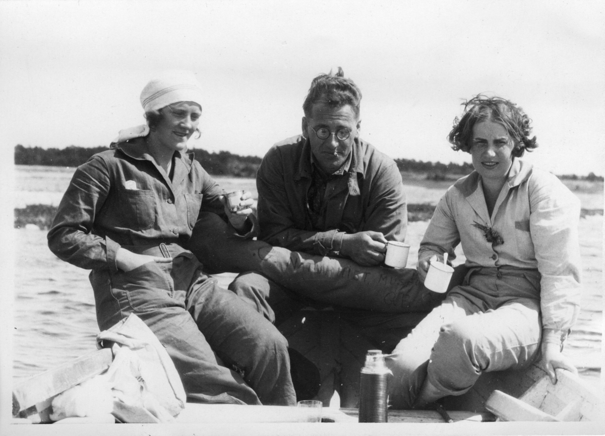 'Serie med 8 fotografier på Sune Swärd som varit verksam på Götebrogs Naturhistoriska Museum. :: :: Sune Swärd tillsammans med 2 kvinnor, Märtha Swärd till höger om honom, okänd kvinna till vänster, samtliga dricker ur koppar och termos, i en båt vid en strand.'