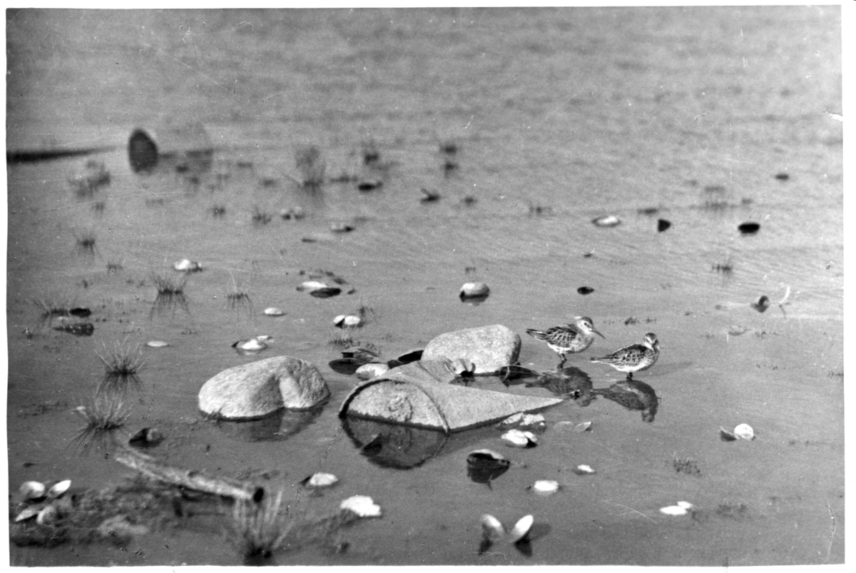 'Kärrsnäppor under flyttning. :: 2 fåglar står i grunt vatten.'