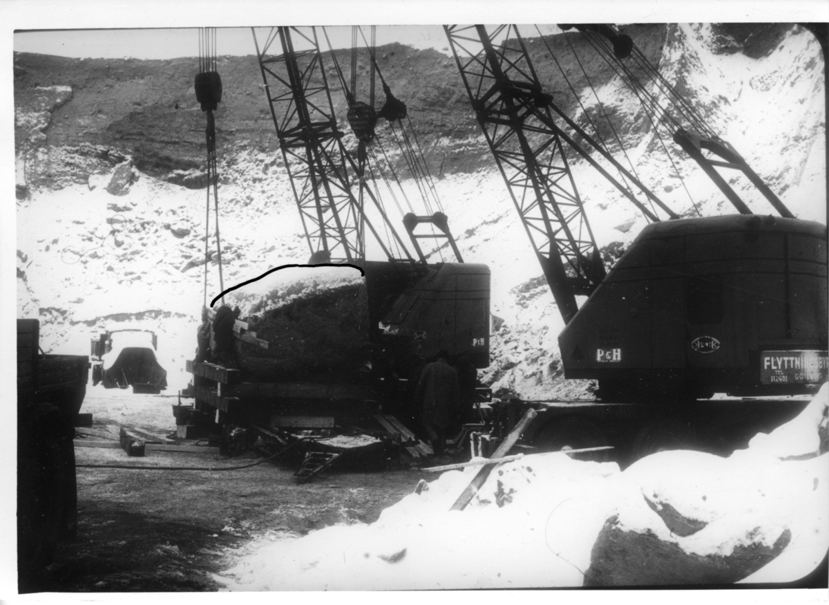 'Geologi :: Flytt av ett stort vindslipat stenblock av ögongnejs från Ellesbo grustag till Göteborgs Naturhistoriska museum. Blocket väger ca 30 ton. :: :: Lastning av stenblocket.'