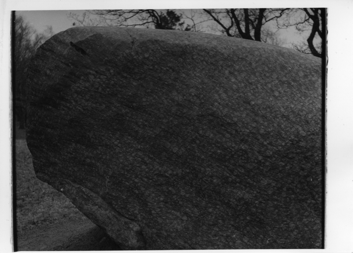 'Geologi :: Flytt av ett stort vindslipat stenblock av ögongnejs från Ellesbo grustag till Göteborgs Naturhistoriska museum. Blocket väger ca 30 ton. :: :: Nära fotografi av stenblocket med en s.k. alveol, en slingrande fördjupning, synlig.'