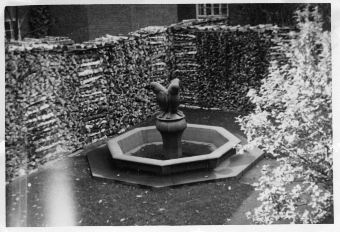 Innergården med huggen ved i staplar längs väggarna. I mitten springbrunnen, fontänen i svart granit med 3 pingviner gjord av Sigrid Friman.