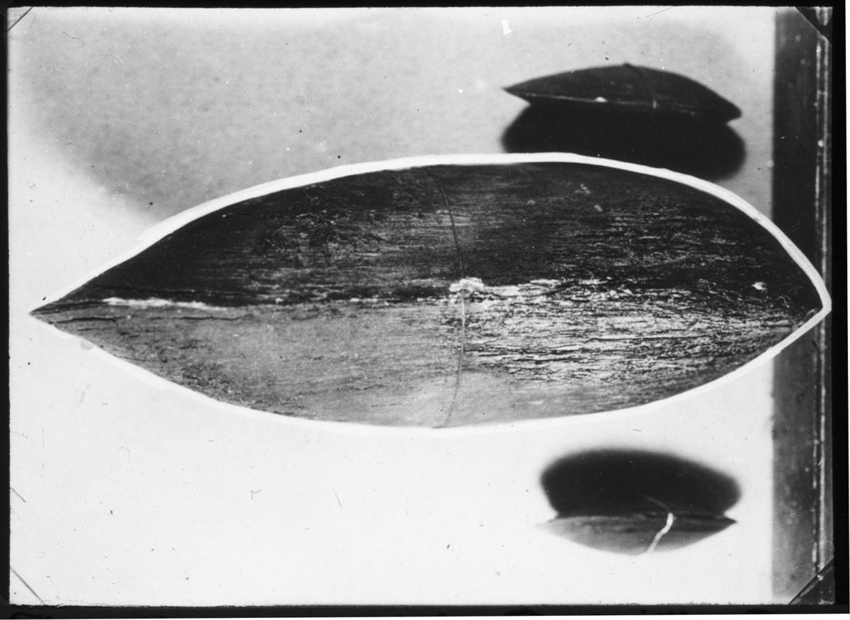 'Bildtext: ''Flodpärlmusslor från Bulsjöån, Forsnäs gård, Ydre härad. Forsnäs tillhör släkten Rääf af Småland.'' Skalet av 1 stor mussla och 2 mindre, sedda från sidan. :: :: Ingår i serie med fotonr. 5120:1-8, se även fotonr. 5119:1-8.'