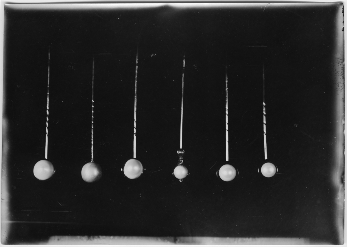 '6 olika smycken med pärla, en slags nålar. :: :: Ingår i serie med fotonr. 5121:1-17, se även fotonr. 5119-5120.'
