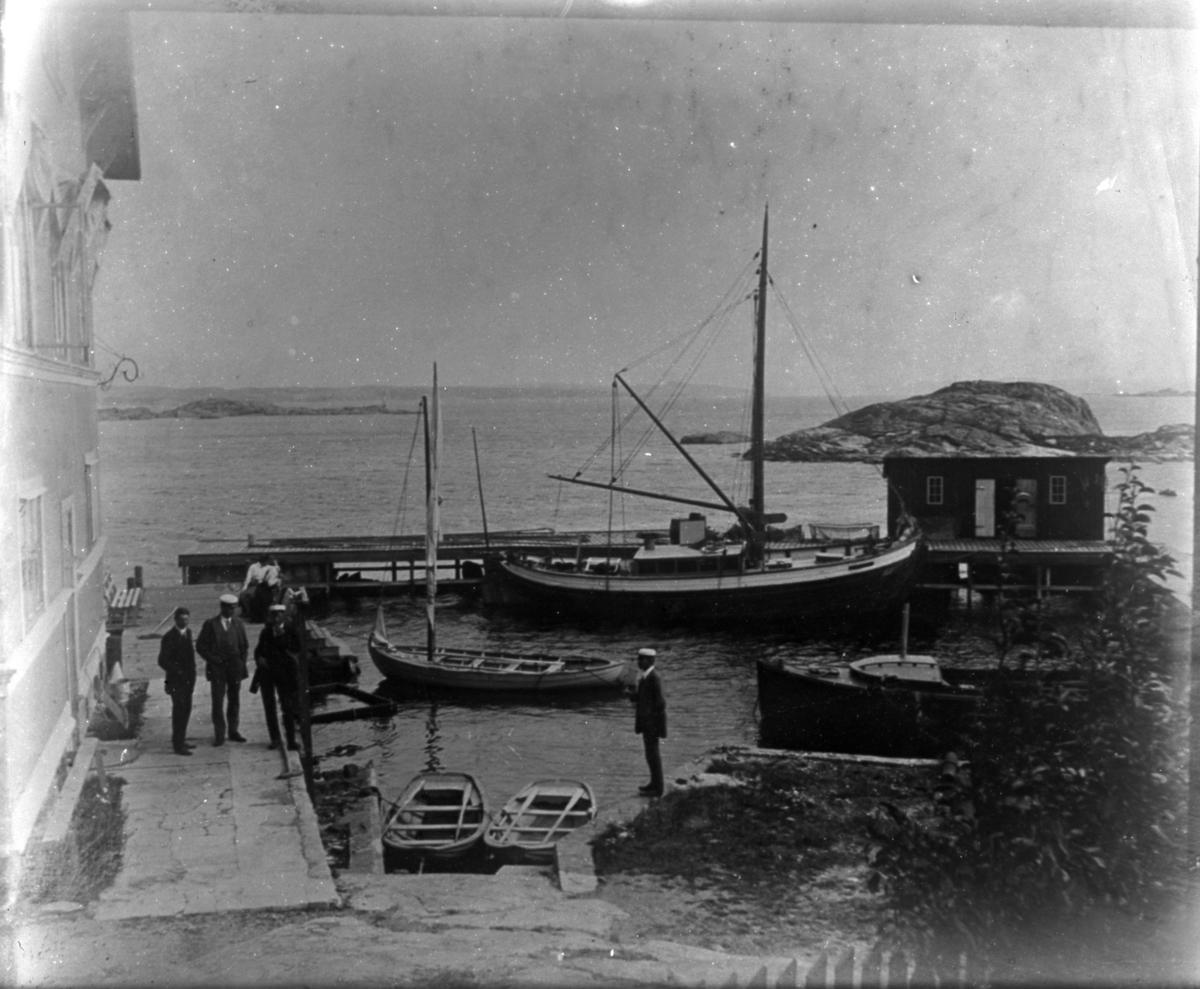 'Vy ut mot havet. I förgrunden båtbrygga med liten träbyggnad. Ca 5 båtar och ekor liggande i hamnen. 4 män iklädda mössa stående på brygga. Ev. sitter 1 kvinna på bänk bakom dem. Till vänster husvägg med fönster. :: :: Ingår i serie med fotonr. 5137 med diverse bilder, en del ev. Kristineberg. Plåtarna ligger i 2 pappaskar. På asken för negativen 8x8 cm står texten: ''Kristineberg negativ samt negativ av havsdjur.'