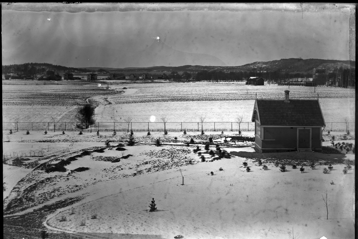 'Vy över fält, snötäckta. I förgrunden liten stuga, litet hus med nyplanterade trädplantor omkring. I fonden ytterligare bebyggelse, gård, hög byggnad till höger. Staket invid huset i förgrunden. Elledningar. Se även fotonr. 5140:7. Detta är troligen del av samma vy som även fotonr. 5140:20 och 22. :: :: :: Ingår i serie med fotonr. 5137 med diverse bilder. Plåtarna ligger i 2 pappaskar. På asken för negativen 9x12 cm och 12x18 cm står texten: ''Fröken Pettersson, Eksjö. Kopieras. Negativ. Alingsås samskola? m.m.'''