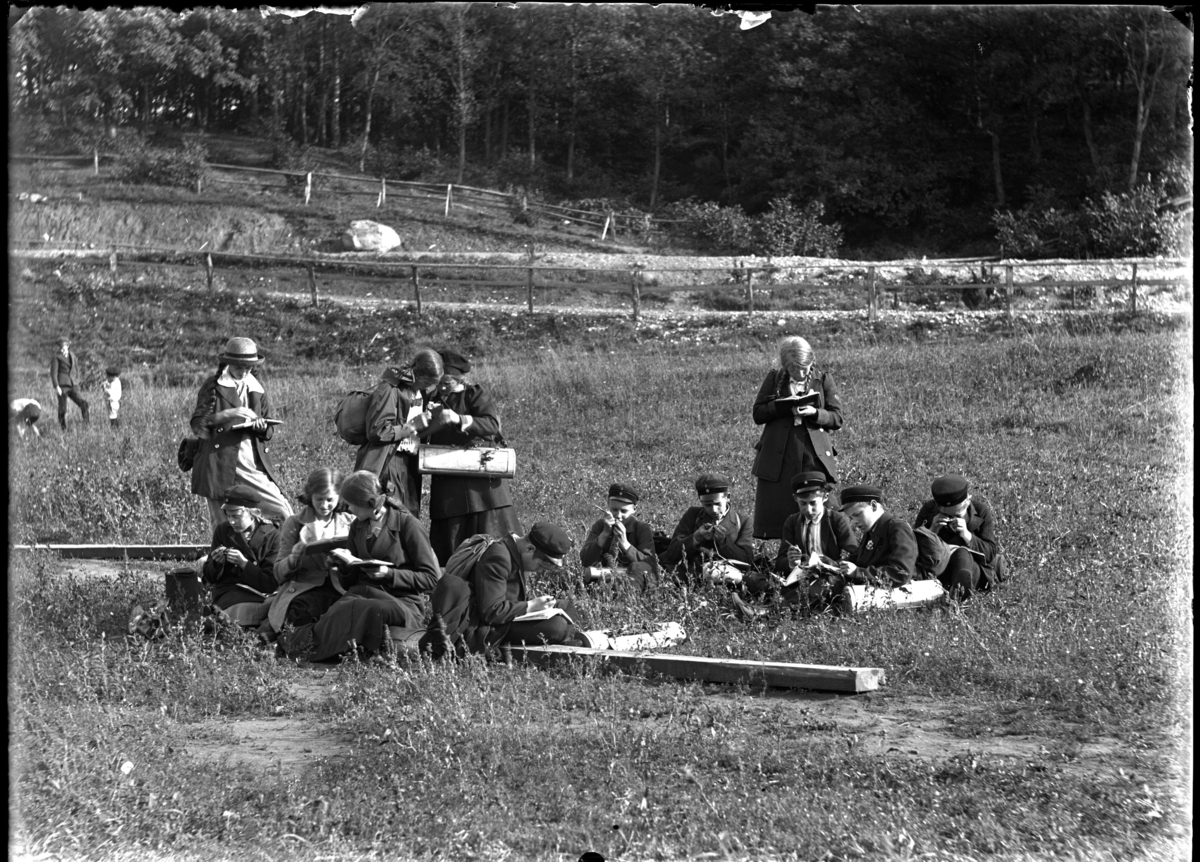 'Gruppbild med 6 pojkar och 7 flickor sittande och stående på öppen gräsmark ev. betesmark. Pojkarna iklädda keps, skärmmössa liksom även 1 flicka. 2 av flickorna iklädda hatt resp. mössa och övriga utan huvudbonad. Flätor. Kappa. Klänning. Kjol. Eleverna på exkursion, utflykt och arbetar med böcker och ev. lupp. Skriver och läser. I bakgrunden ytterligare 1 pojk och 2 mindre barn. I bakgrunden 2 trästaket, innanför bortersta växer lövträd och är ev. betesmark. Ev. väg mellan trästaketen, hagarna. Se även fotonr. 5137:17. :: :: Ingår i serie med fotonr. 5137 med diverse bilder. Plåtarna ligger i 2 pappaskar. På asken för negativen 9x12 cm och 12x18 cm står texten: ''Fröken Pettersson, Eksjö. Kopieras. Negativ. Alingsås samskola? m.m.'''