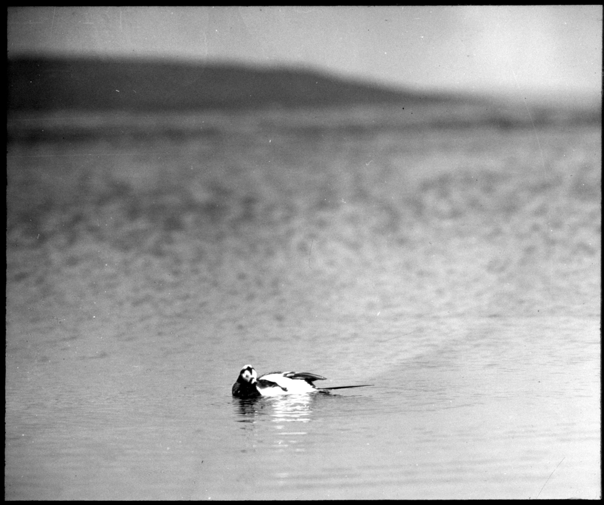 'Bildtext: ''Alfågelhanne river sig med foten.'' 1 alfågelhanne i vatten. :: :: Ingår i serie med fotonr. 5169:1-8, numrerade med bildnr 247-254. Se även hela serien med fotonr. 5155-5174.'