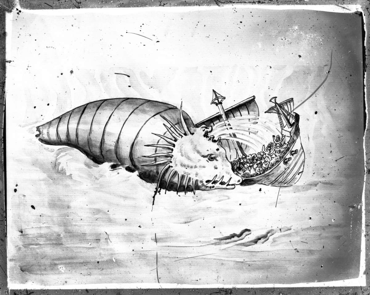 'Teckning av fantasihavsdjur som dyker upp ur vattnet intill en båt full med människor. :: :: Ingår i serie med fotonr. 5202:11-18. Se även hela fotonr. 5202-5218 med bilder från Frits Johansen.'