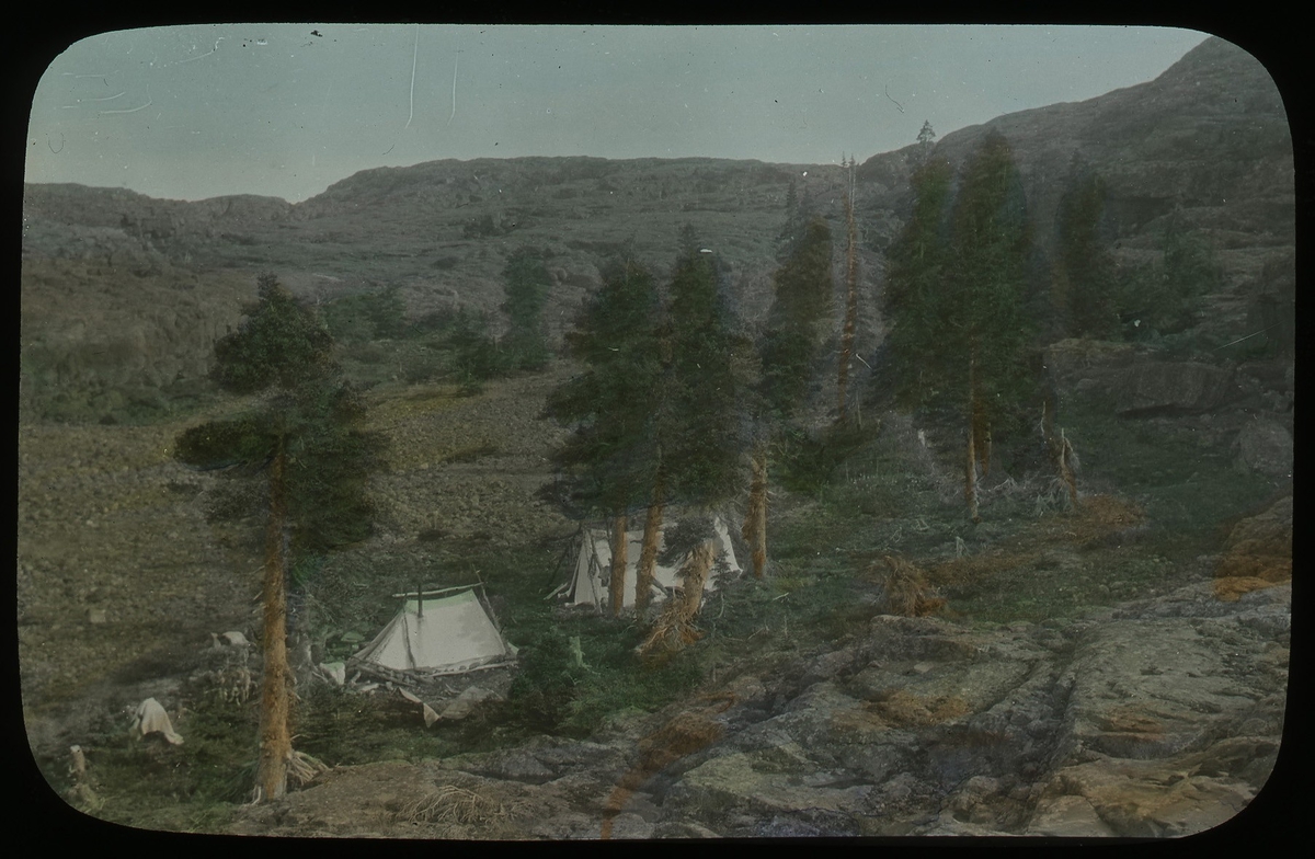 'Vy med läger med tält uppställda bland enstaka barrträd på i övrigt kala berghällar. I bakgrunden berg. :: :: Text på glaset: ''Natural resourses intelligence branch.'' :: :: Ingår i serie med fotonr. 5204:1-19. Se även hela fotonr. 5202-5218 med bilder från Frits Johansen.'