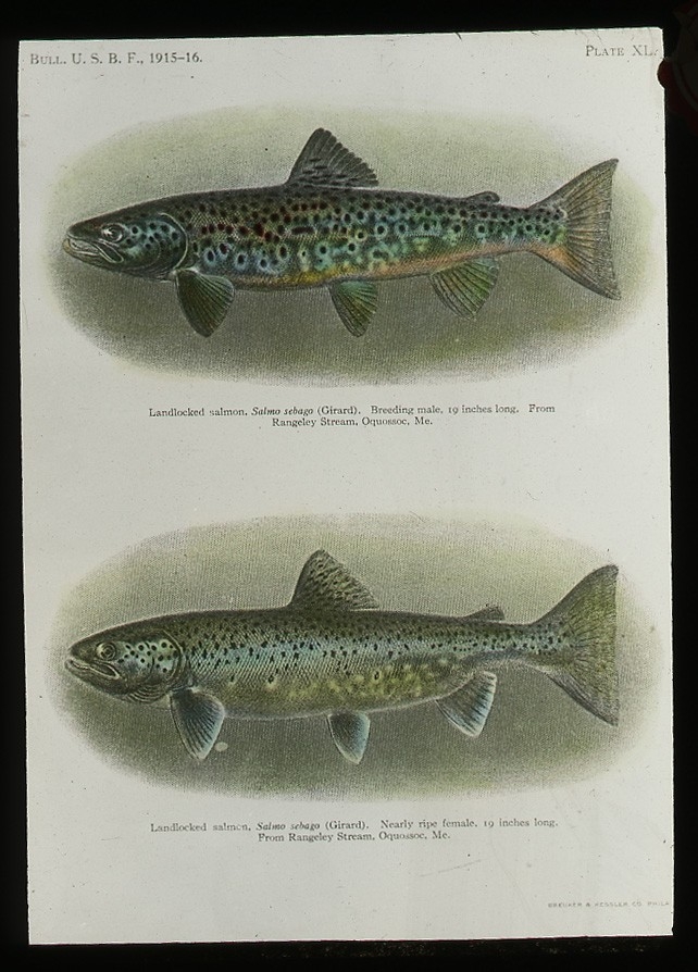 'Illustration av 2 st laxfiskar.Text under bilden: ''Landlocked salmon, Salmo sebago (Girard.) Breeding male, 19 inches long. From Rangeley stream, Oquossoe, Me, överst samt Landlocked salmon, Salmo sebago (Girard.) Nearly ripe female, 19 inches long. From Rangeley stream, Oquossoe, Me, nederst. ''Text på glaset:'' hona och hane av Landolocked salmon (Salmon sebago) - maine''. Och ''Department of the interior.'' :: :: :: Ingår i serie med fotonr. 5205:1-20. Se även hela fotonr. 5202-5218 med bilder från Frits Johansen.'