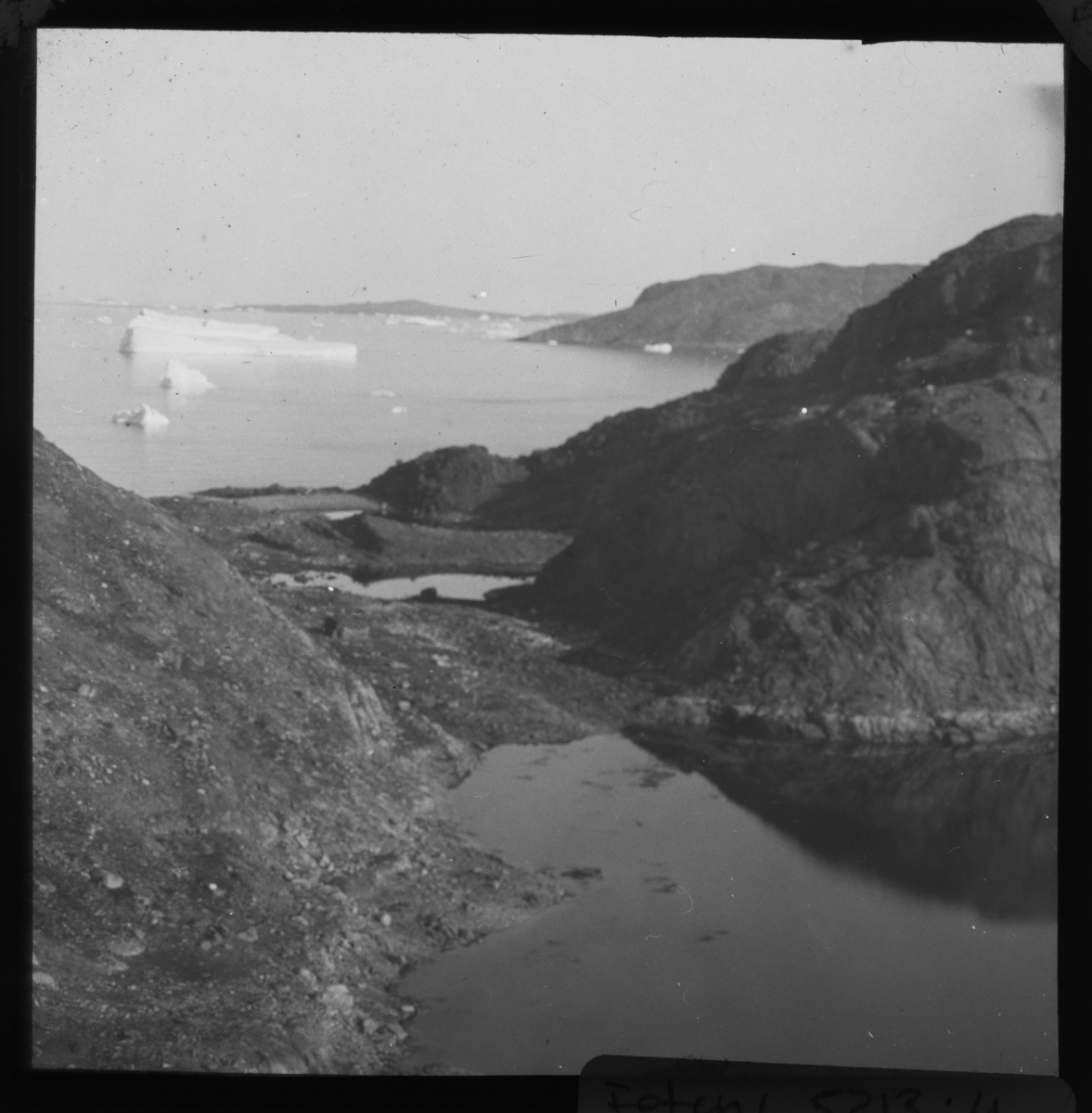 'Vy med berg och isberg, isflak i vatten. :: :: Ingår i serie med fotonr. 5213:1-7, se även fotonr. 5217:1-98. Se även hela fotonr. 5202-5218 med bilder från Frits Johansen.'