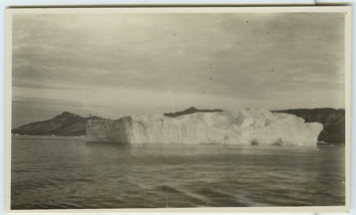 'På bilden syns ett isberg i Diskobukten och berg i bakgrunden. Bilden är en vy över ''Flakkerhuk'' - Pynten, sedd från norr nära Qullissat kolgruva på östsidan av Disko ön vid Vaigat, med ett stort isberg i förgrunden. :: :: Enligt kuvertet som negativet låg i ''Trip to W-Greenland IV''. :: :: :: Ingår i serie Fotonr. 5217:1-103. Se även hela fotonr. 5202-5218 med bilder från Frits Johansen.'