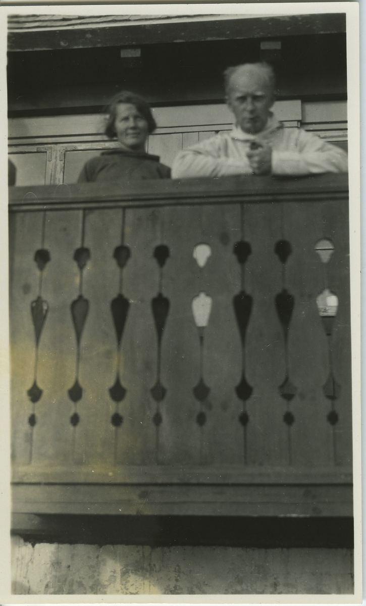'1 kvinna och 1 man. Paret Dr. Rask vid sitt trähus, på en balkong? Dr. Rask håller en pipa i handen. Klädda i anorak. Kläder. Klädsel. :: :: Ingår i serie Fotonr. 5217:1-103. Se även hela fotonr. 5202-5218 med bilder från Frits Johansen.'