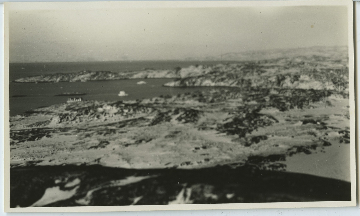'Vy över kusten norrut, Snöklädda basaltberg i bakgrunden. Jakobshamn. :: :: Ingår i serie Fotonr. 5217:1-103. Se även hela fotonr. 5202-5218 med bilder från Frits Johansen.'