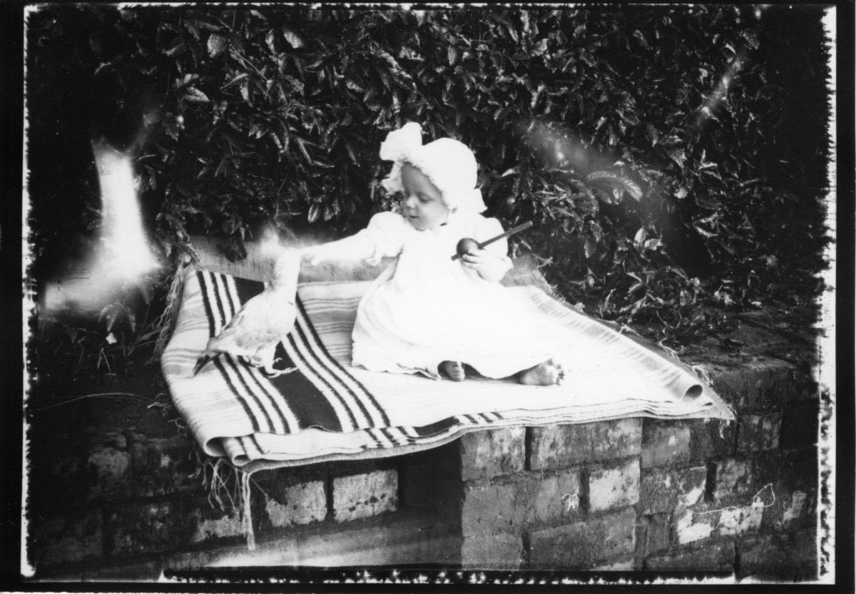 'Diverse fotografier från bl.a. dåvarande Nordrhodesia, nu Zambia, tagna av Konsul Magnus Leijer. :: :: 1 bebis sittande på 1 matta på en tegelmur, lekandes med 2 fåglar.'