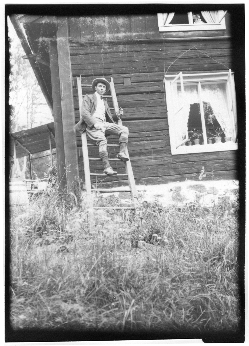'Diverse fotografier från bl.a. dåvarande Nordrhodesia, nu Zambia, tagna av Konsul Magnus Leijer. :: :: En man sittandes med en pipa på en trästege lutad mot ett trähus, till höger står ett fönster öppet.'