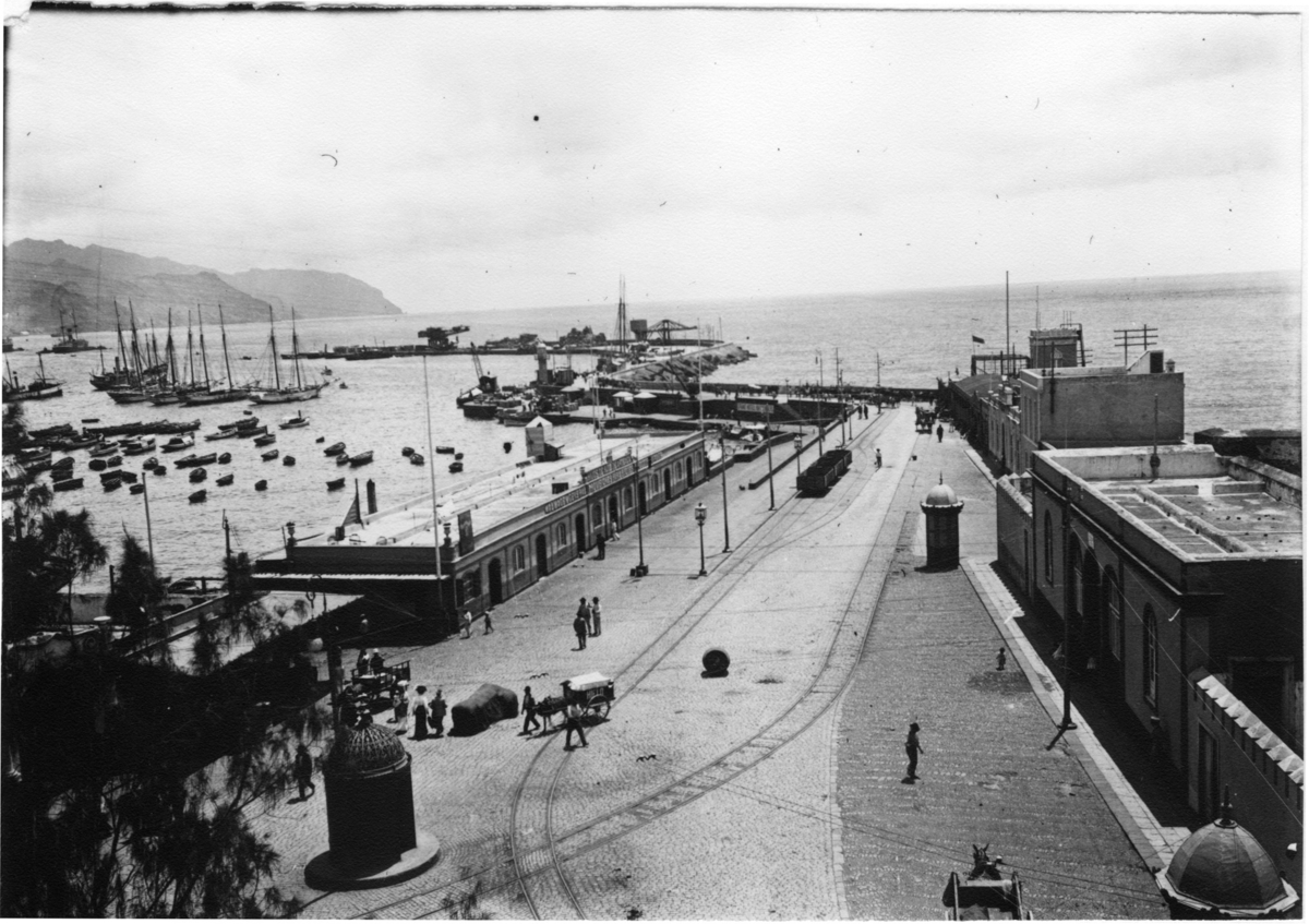 'Diverse fotografier från bl.a. dåvarande Nordrhodesia, nu Zambia, tagna av Konsul Magnus Leijer. :: :: Vy över hamn med pir, på denna rör sig människor, byggnader, rälsvagnar samt diverse båtar.'