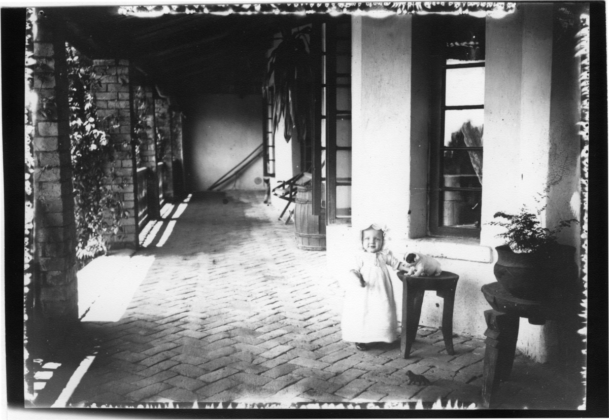 'Diverse fotografier från bl.a. dåvarande Nordrhodesia, nu Zambia, tagna av Konsul Magnus Leijer. :: :: Ett barn ståendes vid en pall, med en hundvalp på, på en tegelveranda. Barnet tittar in i kameran.'