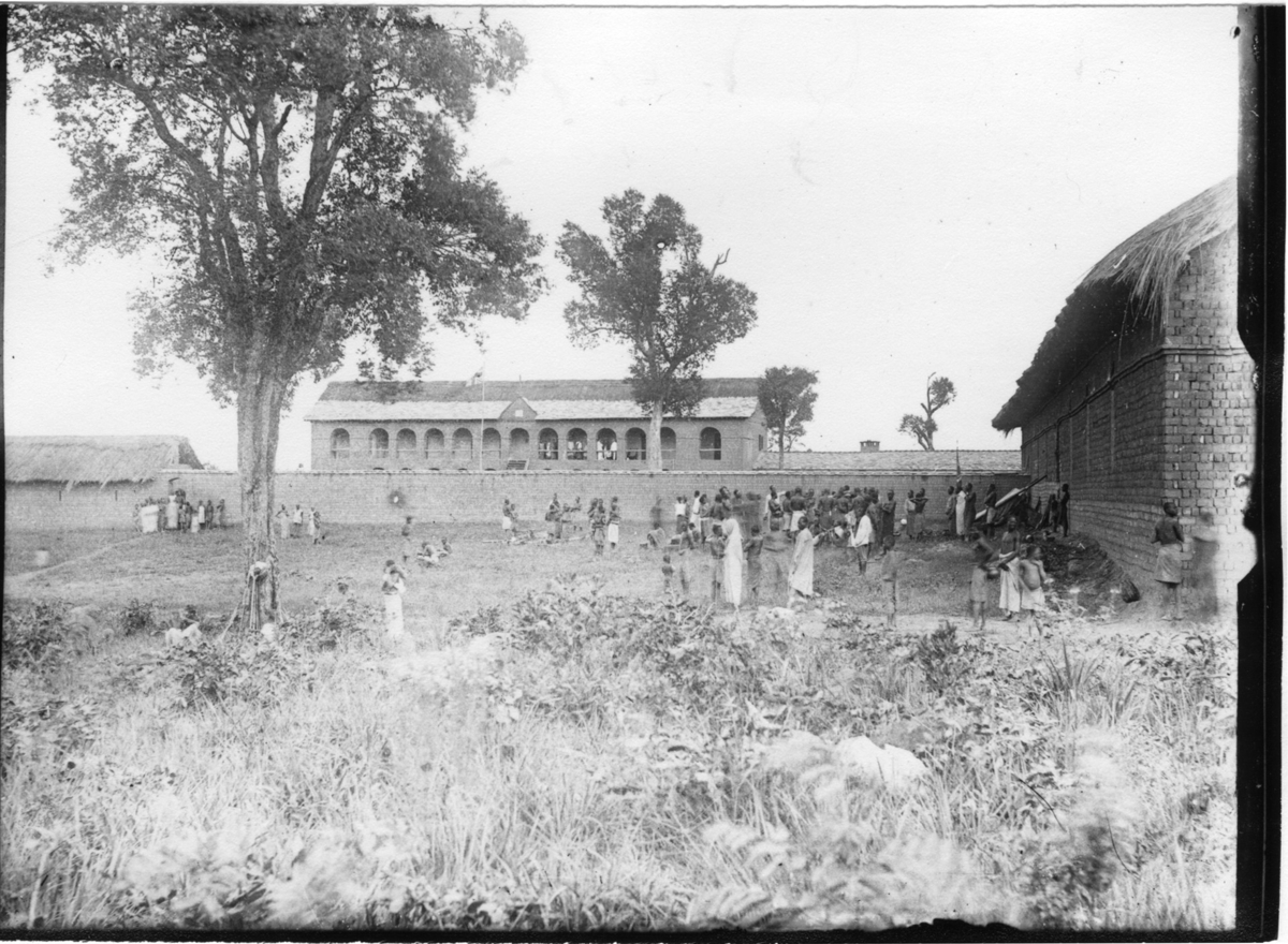 'Diverse fotografier från bl.a. dåvarande Nordrhodesia, nu Zambia, tagna av Konsul Magnus Leijer. :: :: Ett större antal människor utanför en tegelmur omgärdande en tegelbyggnad, vid muren ytterligare 2 byggnader av olika storlekar.'